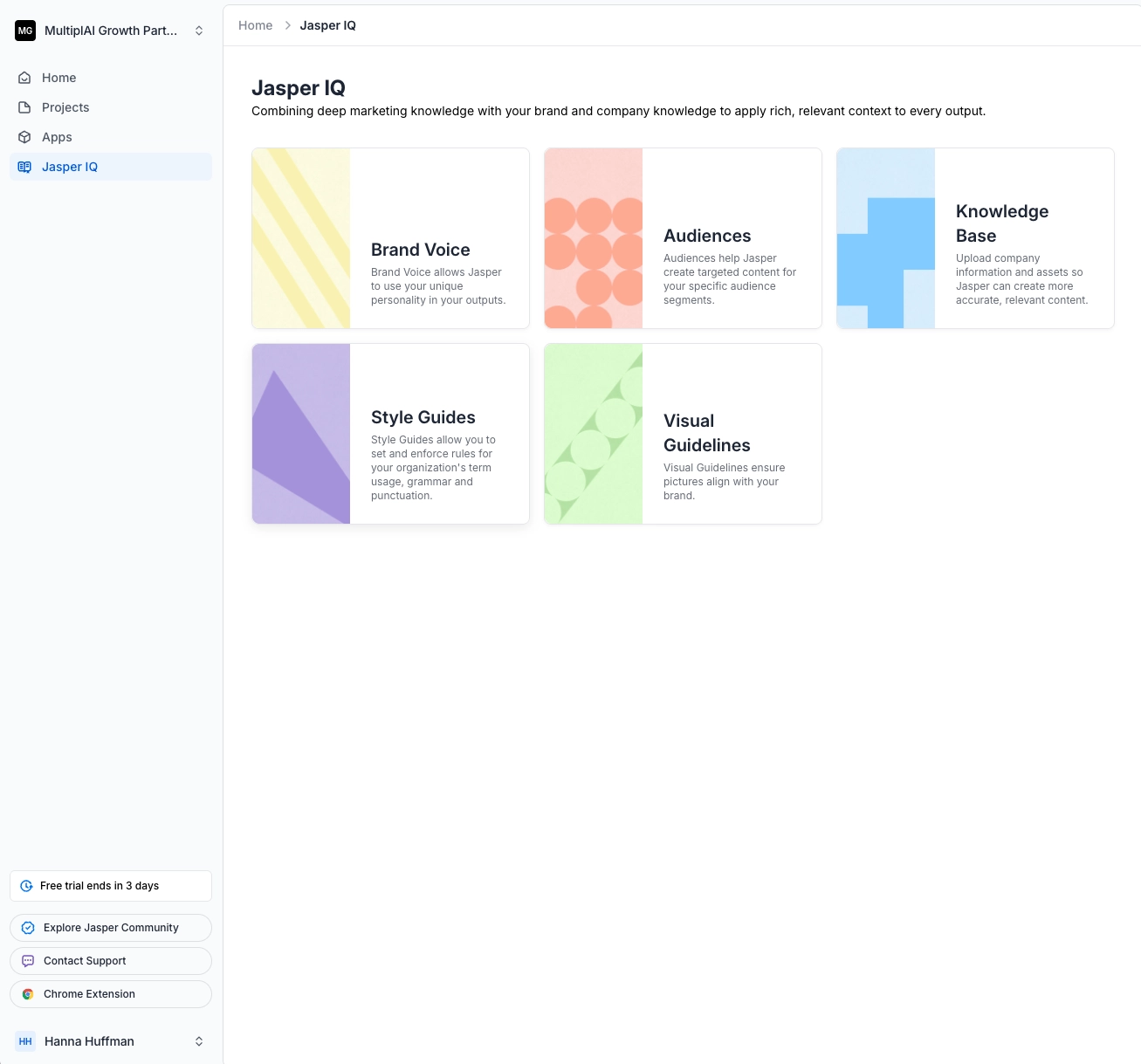 The Jasper IQ knowledge base is a solid concept. Being able to load brand voice documents, audience research, and strategic context into a centralized system that informs every output is the right idea. The interface for managing this information is clean and well-organized. You can set up audience profiles with buying triggers, use case requirements, and detailed descriptions. It asks good questions during setup.