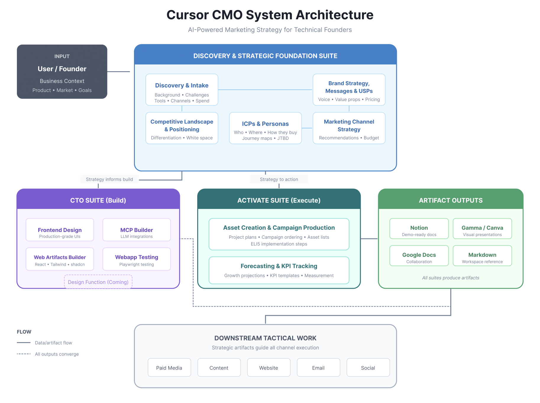 - The second suite handles building: frontend design, web applications, internal tools. The CTO side of the house for when strategy needs to become product— this part is inspired by a podcast I mentioned in my last post.