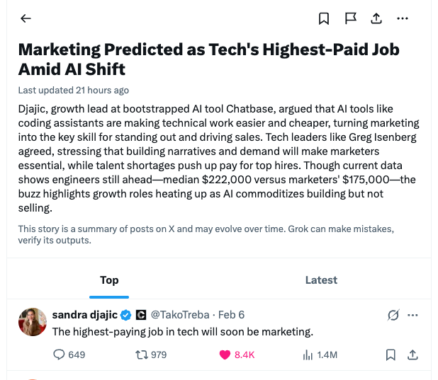 Something unusual happened on tech Twitter over the past two weeks. Not the usual AI hype cycle. Not another framework debate. A growth lead at an AI company named Sandra Zizak posted a simple prediction: the highest-paying job in tech will soon be marketing.